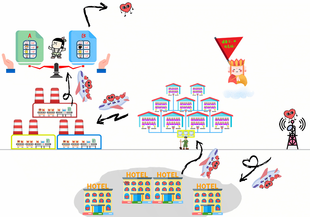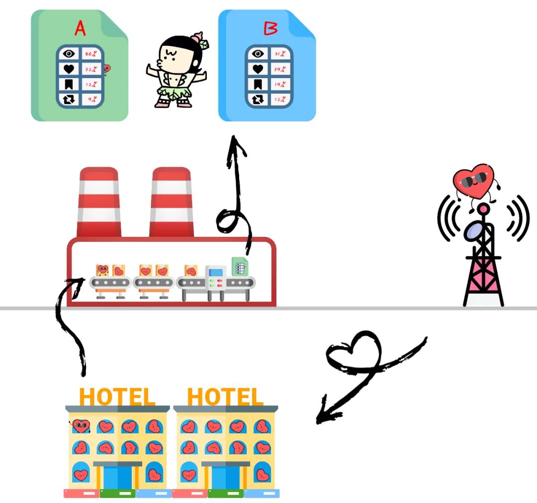 3、这个大酒店里好吃好喝,但就是有些寂寞,各个数据也相互不见面。小红心本以为自己就要在这里颐养天年了。但是,几天之后,它却收到邀请,要去参加一个有趣的游戏。原来,字节的老师傅们写了一个系统,用来把“A组文章”和“B组文章”的阅读情况分别进行汇总。