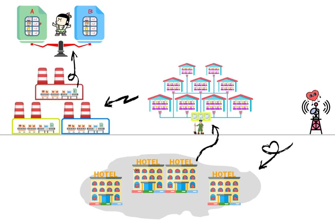 2、在服务器中,小红心见到了和它一样的来自各地的数据,它们列队整齐,被安排入住在一个叫做”数据库“的巨大酒店里。