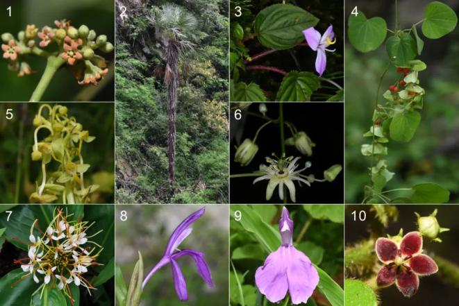 图为:1.吉隆牛奶菜;2.塔基棕榈;3.喀西蜂斗草;4.旋花锡生藤;5.吉隆角盘兰;6.尼泊尔西番莲;7.椭穗姜花;8.藏南象牙参;9.象牙参;10.箭药藤。图片来源:中国科学院西双版纳热带植物园