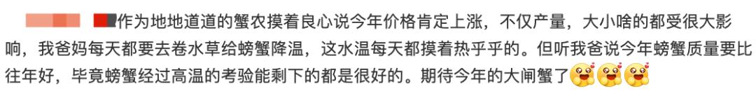 多位蟹农都对媒体表达了担忧。据他们的经验,成蟹比往年小,之前大闸蟹的平均规格可以达到4两,今年可能只有3.5两,6两以上的大体型大闸蟹产量预计会明显减少。据他们预测,江苏地区大闸蟹的整体产量将减少两成。