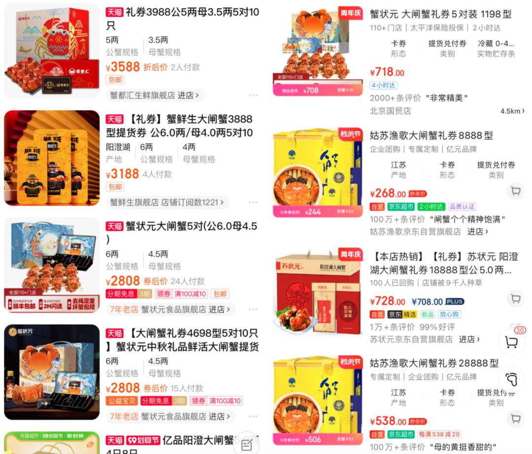一个最常见的坑是,很多消费者并不知道如何挑选蟹券,券上的标价往往具有很大的迷惑性。电商平台上的“蟹券”分为“988型”“2888型”“3988型”“18888型”等各种型号,但消费者并不了解这些型号代表的意义,也很难从这些型号推断螃蟹的实际价值。