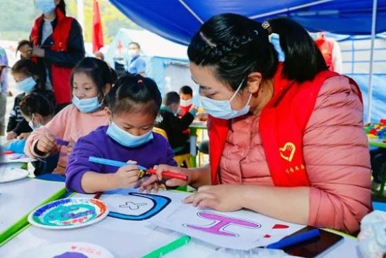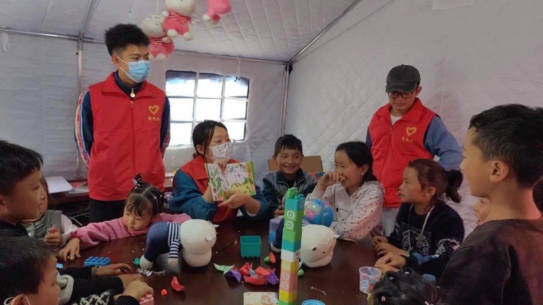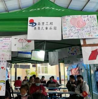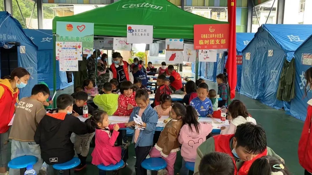 随后的两天时间里,甘孜州和雅安市各级团组织都针对儿童开启了专项志愿服务。在甘孜州和雅安市的多个安置点建立的“青青儿童乐园”里,配备了大学生志愿者陪护照看震区儿童。