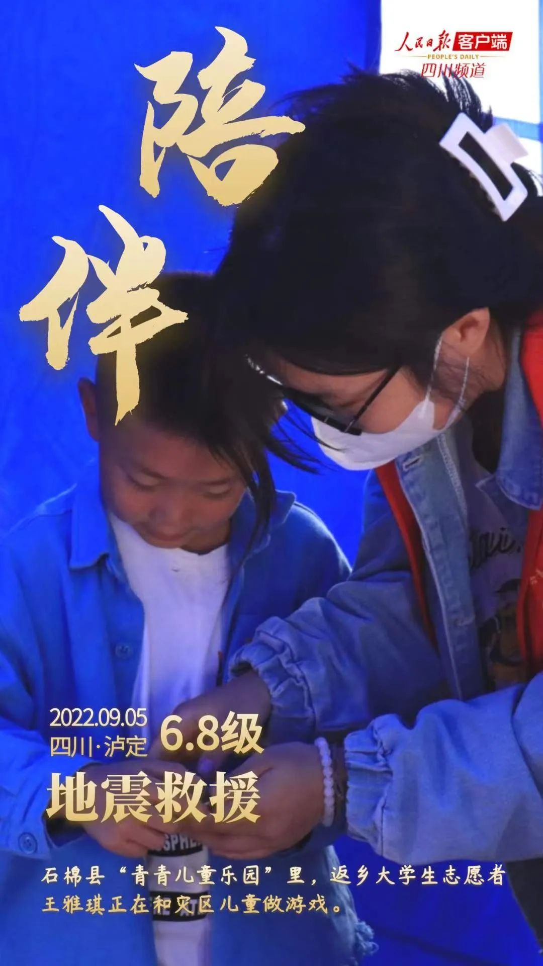 在灾情严重的雅安市石棉县,一群大学生成了抗震救灾的特殊力量。内江师范学院大四学生徐萌家在石棉县,因疫情还未开学,地震后她第一时间向社区报到,在世纪广场安置点的“青青儿童乐园”开展志愿服务。