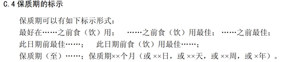 其实,不同国家有着自己的食品保质期标注规定。在我国,根据GB 7718-2011《食品安全国家标准预包装食品标签通则》[18]给出的保质期相关标示包括: