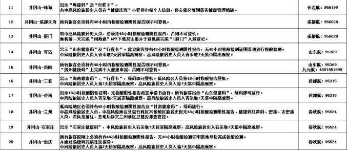 到达井冈山机场的旅客,须扫机场“场所码”,凭赣通码绿码、行程码和体温正常(<37.3℃)方可通行。所有省外或省内有疫情报告地区来(返)吉人员均需提前3天向居住地所在社区(村组)、单位或宾馆酒店进行报备。该机场已在航站楼到达口设置免费核酸检测点,广大旅客应主动配合工作人员有序开展采样工作。