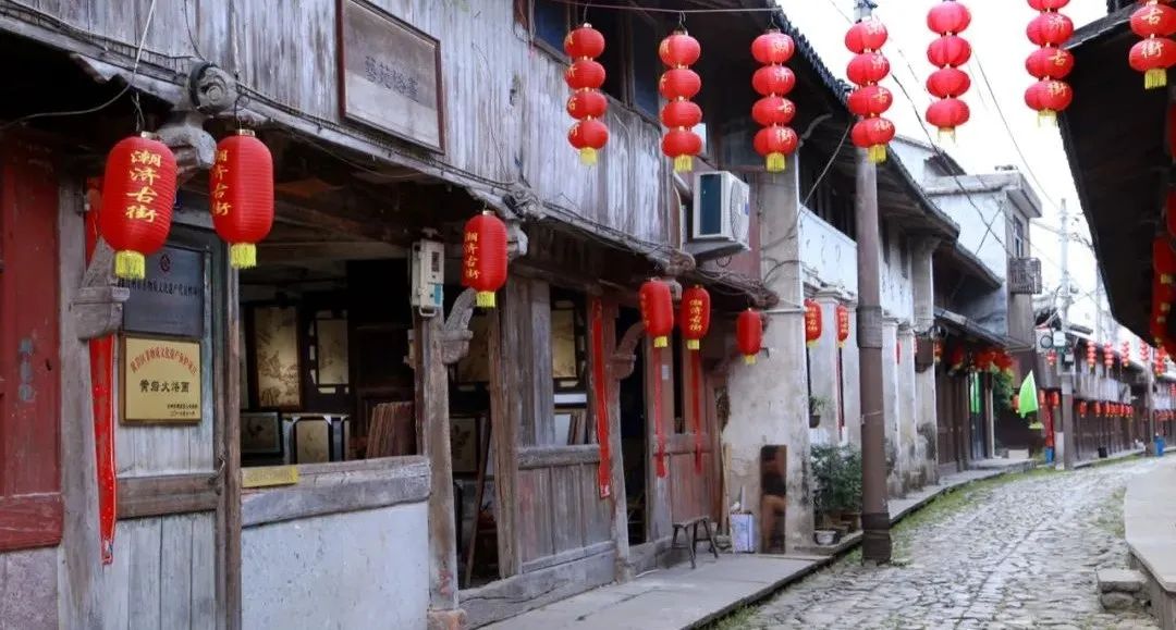 潮济古街在永宁江的上游,始建于清末,大约有一公里,布局为主街南北走向,南起三官坛,北至沚江亭,长约260米,街面宽3.5米。