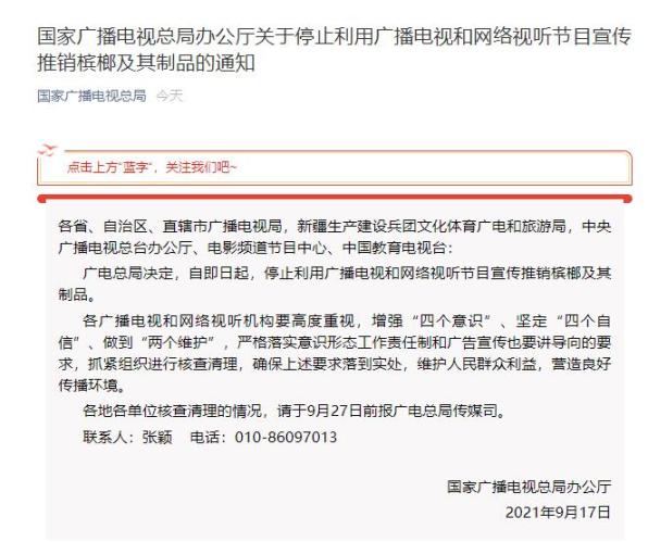 早前,2021年9月17日,国家广播电视总局办公厅发布通知,要求停止利用广播电视和网络视听节目宣传推销槟榔及其制品。通知原文如下:
