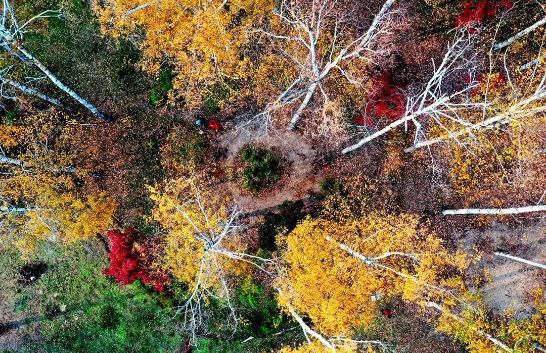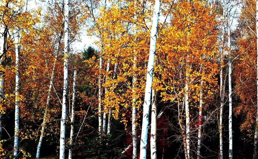 待到深秋时节,白色的树干在风中矗立,瑟瑟秋风吹起一片片金色树叶,此情此景是无尽的诗情画意。