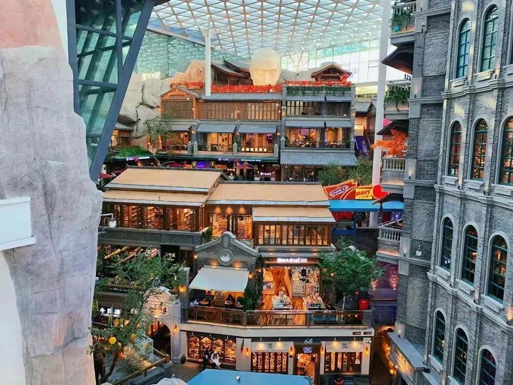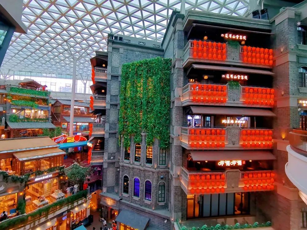 这有山里中堂高挑,入眼便是一处圆形公共空间,周边有三个通道继续深入。台阶层层叠叠而上,两侧店铺像建在山丘之上,仿佛山城重庆洪崖洞。