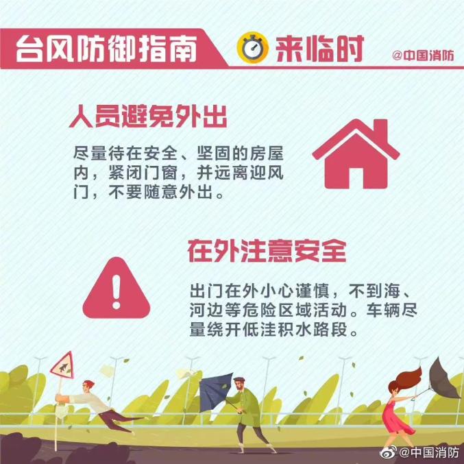 而当台风来临时则需继续关注台风动态信息,最好不要出门。如果在户外则需要注意: