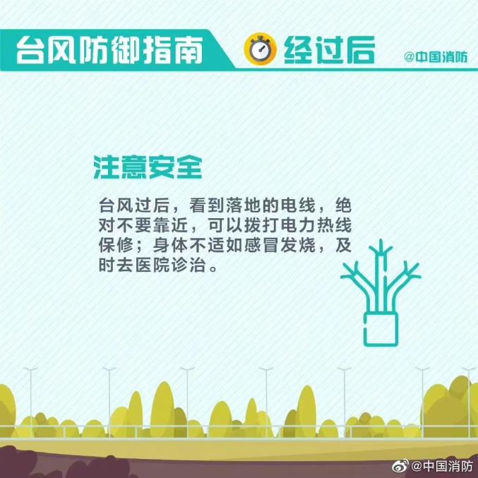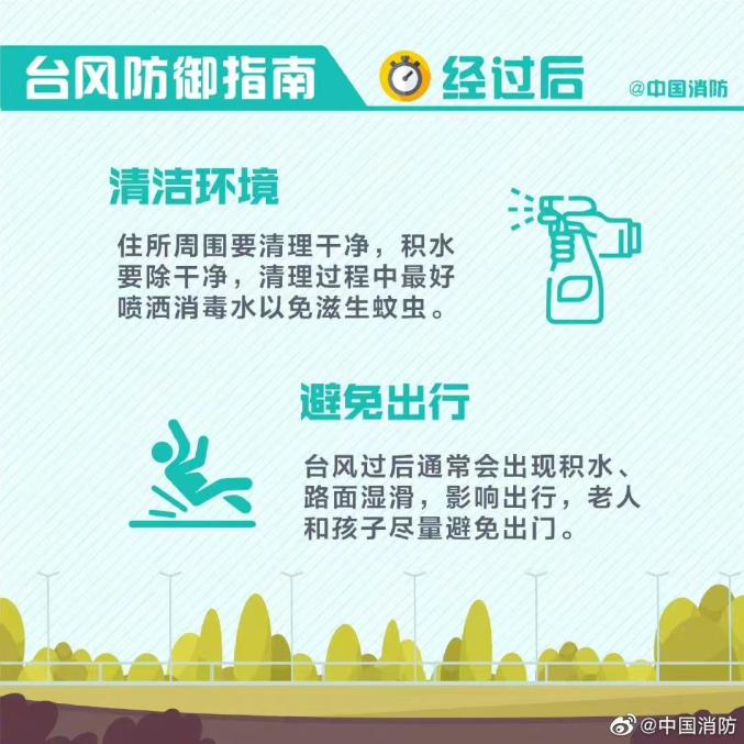 台风过境后,还要注意不去地质灾害点,灾后出门一定要事先了解路段情况。另外,也要记得及时清除垃圾、人畜粪便,对受淹的住房和公共场所及时做好消毒和卫生处理。