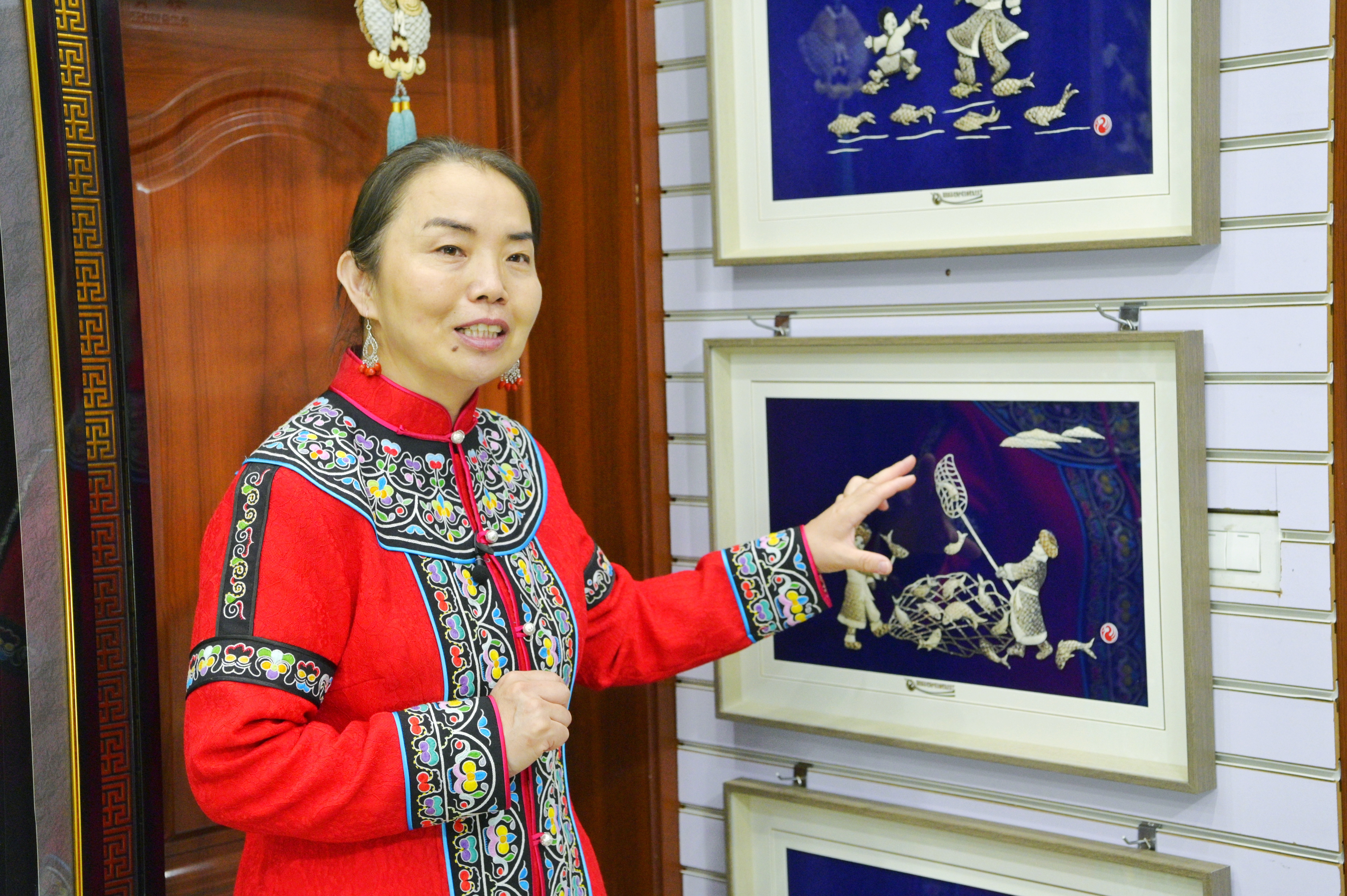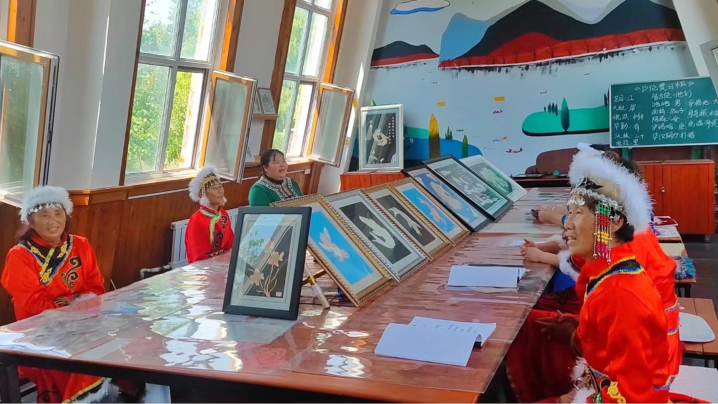 位于饶河县城的尤雪松鱼皮技艺工作室,传统的鱼皮服饰、民族风情画,融合创新的鱼皮现代画、鱼皮钱包、钥匙链等,吸引着当地百姓和游客到店欣赏和购买。