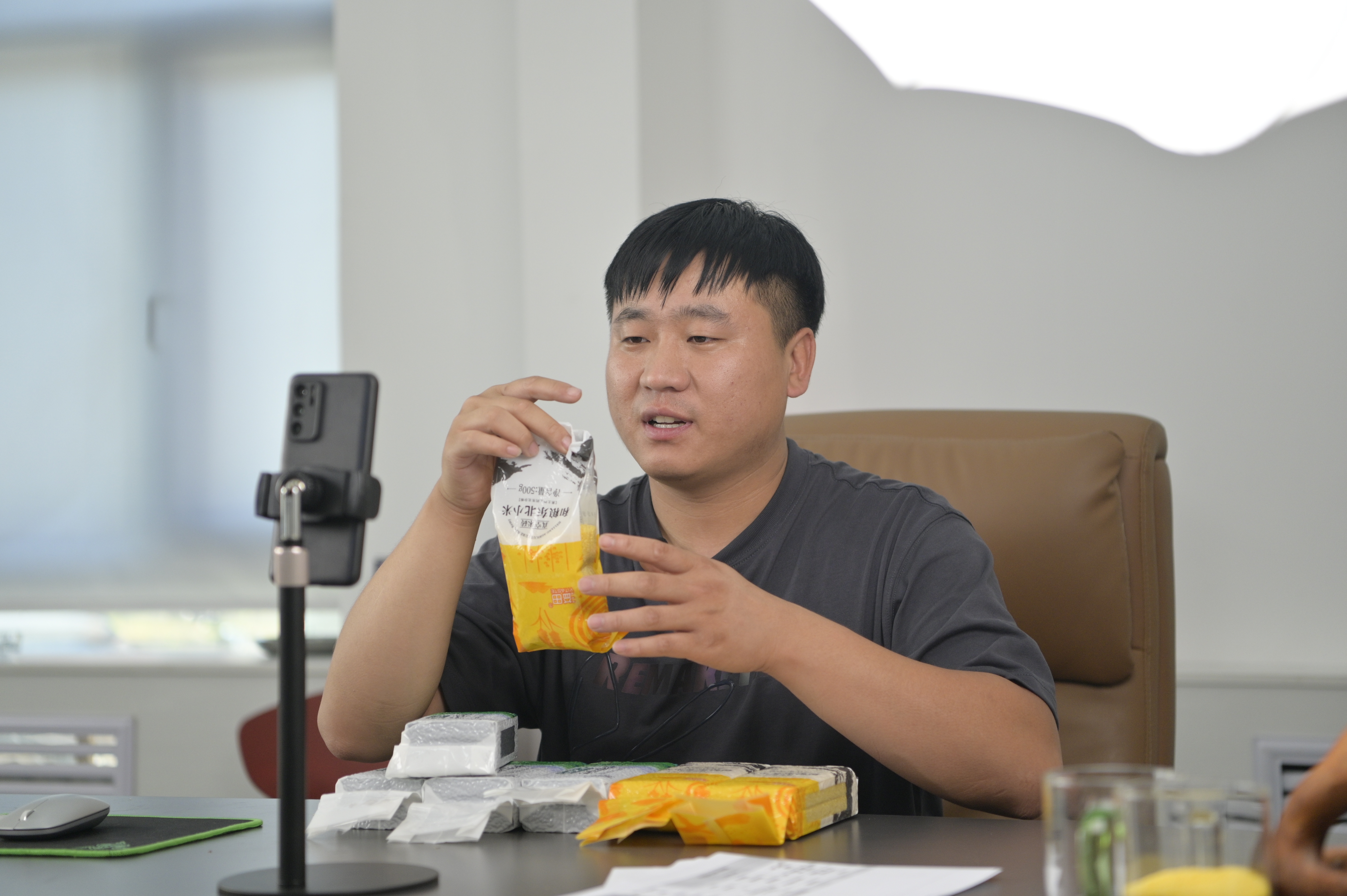 在饶河县直播电商孵化基地,卢战开忙着在流水线上帮忙打包蜂蜜,为直播带货选择产品。在政府部门支持下,卢战开将工作室从村里搬到了县里,入驻了电商基地。