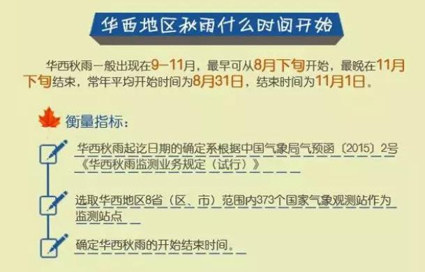 华西秋雨(陕西区)常年开始时间为9月12日,结束时间为10月8日。秋雨开始后,截至10月31日再无多雨期出现,则秋雨结束,最后一个多雨期的结束日为当年该区域的秋雨结束日。
