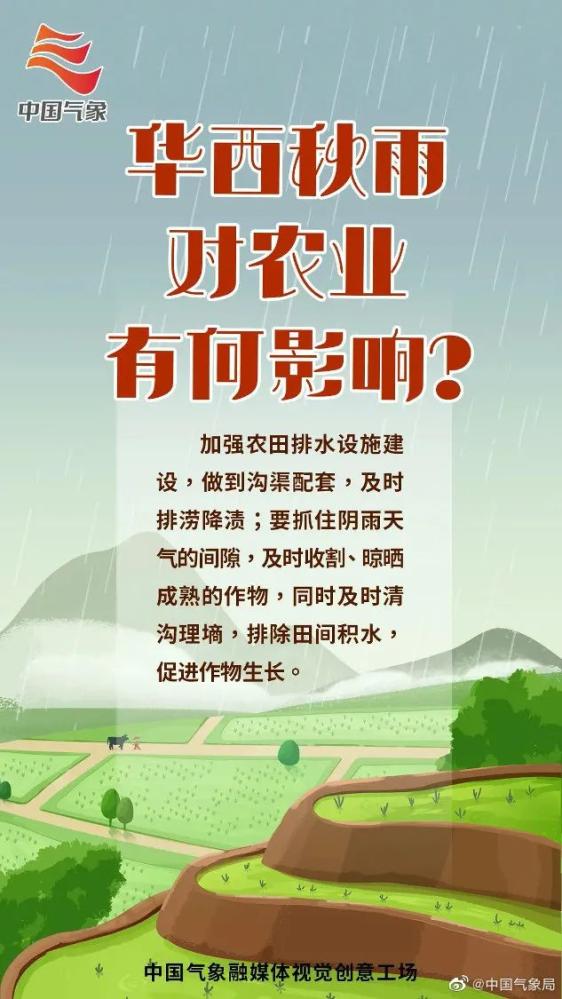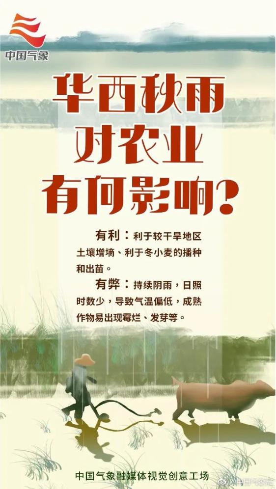 秋季是秋收秋种的关键时期,“秋绵雨”对农业既有有利的一面,也有不利的一面。有利的是,秋雨有利于较干旱地区的土壤增墒、利于冬小麦的播种和出苗,农谚有云“你有万担粮,我有秋里墒”;弊端是持续阴雨天气,日照时数少,导致气温偏低,成熟作物易出现腐烂、发芽等。