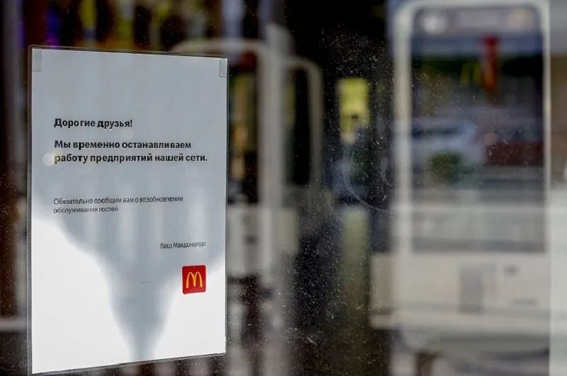当地时间2022年5月16日,俄罗斯首都莫斯科麦当劳门店贴出闭店通知,图自澎湃新闻“蹲踞式起跑”
