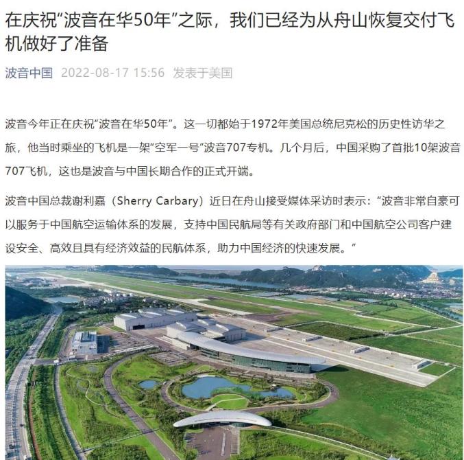“中国是我们航空业的一个重要市场,我们支持中国民航发展已经有50年之久。虽然对我们飞机的需求依然强劲,但有关进展的时机也取决于有其他因素,包括地缘政治和新冠疫情等。在这个动态化的时期,我们正在与客户密切合作。