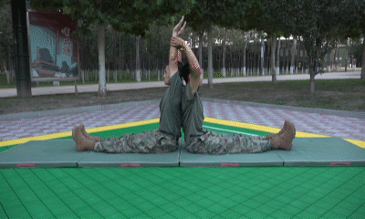 两人背向就坐于垫子上,背部贴近,其中一人双臂向上伸展,另一人抓住其小臂,缓慢向后伸展,帮助其打开胸腔,感觉腹部有拉伸感即可。全程保持均匀呼吸,拉伸完毕进行交换。建议重复动作12次。