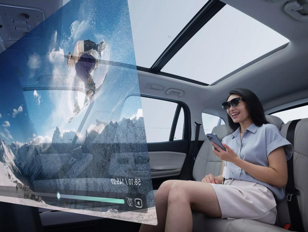 但因为它是一个车规的产品,这样的一个屏幕带来的是巨大的一个成本。我们进而去想,有没有可能有替代的方案,又能达到巨幕般的投影体验,同时它还对车的空间不带来一个入侵式的一个影响?眼镜就是最好的一个点。