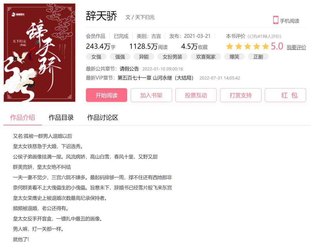 爆款剧集《天盛长歌》《扶摇》原著作者天下归元的新作《辞天骄》便体现了这一趋势。小说延续了她一贯的双强CP与权谋背景,讲述了阴差阳错成为储君的女主面对男性当权的朝堂,小心谨慎、独立自强,将自己的命运握在手中的故事,可谓性转女帝版《天盛长歌》,具有普世价值观。