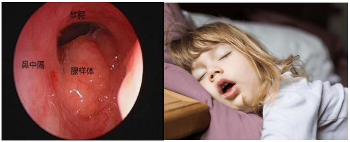 4、腺样体肥大:腺样体肥大会造成上呼吸道的阻塞,出现夜间呼吸声音加重,甚至打鼾。儿童经鼻呼吸的模式受到影响被迫进行张口呼吸,会导致儿童记忆和认知功能受损、注意缺陷和多动、情绪问题、心血管功能受损等问题,严重者还可形成“腺样体面容”,出现上牙前突、开唇露齿、下颌后缩、面部拉长等表现(见下图右侧)。如果您的孩子经常出现夜间打鼾和张口呼吸的症状,建议及时带孩子到医院行鼻咽部侧位片检查,避免出现长期损害和不可逆后果。