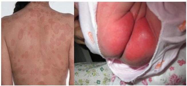 8、荨麻疹:荨麻疹的患儿皮肤发红,局部皮肤也突然肿起来,有时候还会出现眼、耳、嘴唇等部位的肿胀,一般使用抗组胺药物(如氯雷他定或西替利嗪)很快就可以控制。