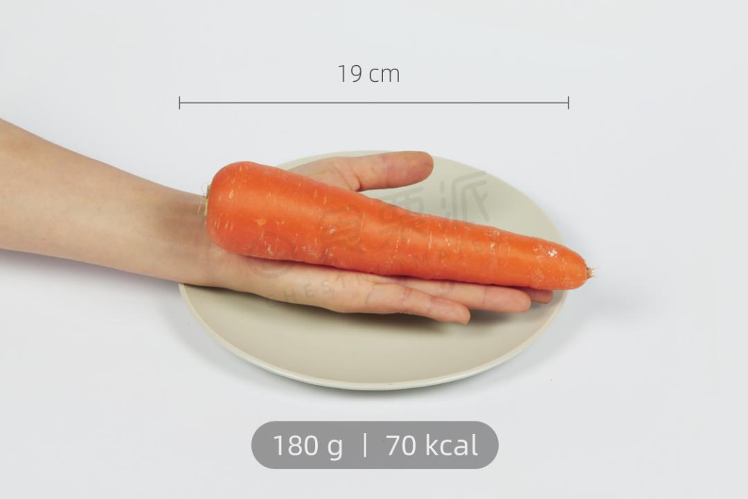 下图的这根胡萝卜重180g,深色蔬菜占一半(半斤)的话,一次吃1根半刚刚好。