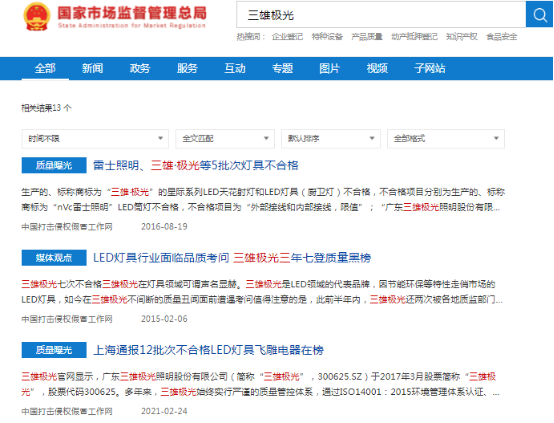 值得关注的是,2021年12月,三雄极光因灯具质量问题两次被上海市市场监督管理局提名。