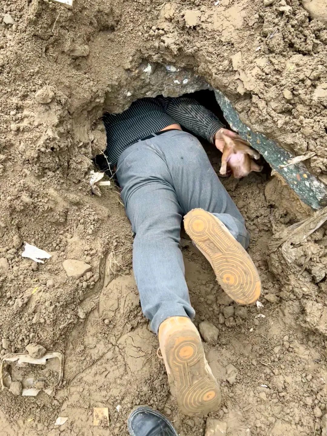 听说石板下面有一窝刚出生不久的流浪狗崽,小伙子急忙叫停了旁边正在施工的挖机,二话不说俯身爬进三十厘米不到的洞口,将四只小狗依次递了出来。让我感到“融化”的是,这位小伙子身上体现出对生命的珍惜与保护、勇敢与力量,不在意别人异样的眼光,尽自己的努力去做有爱的事。