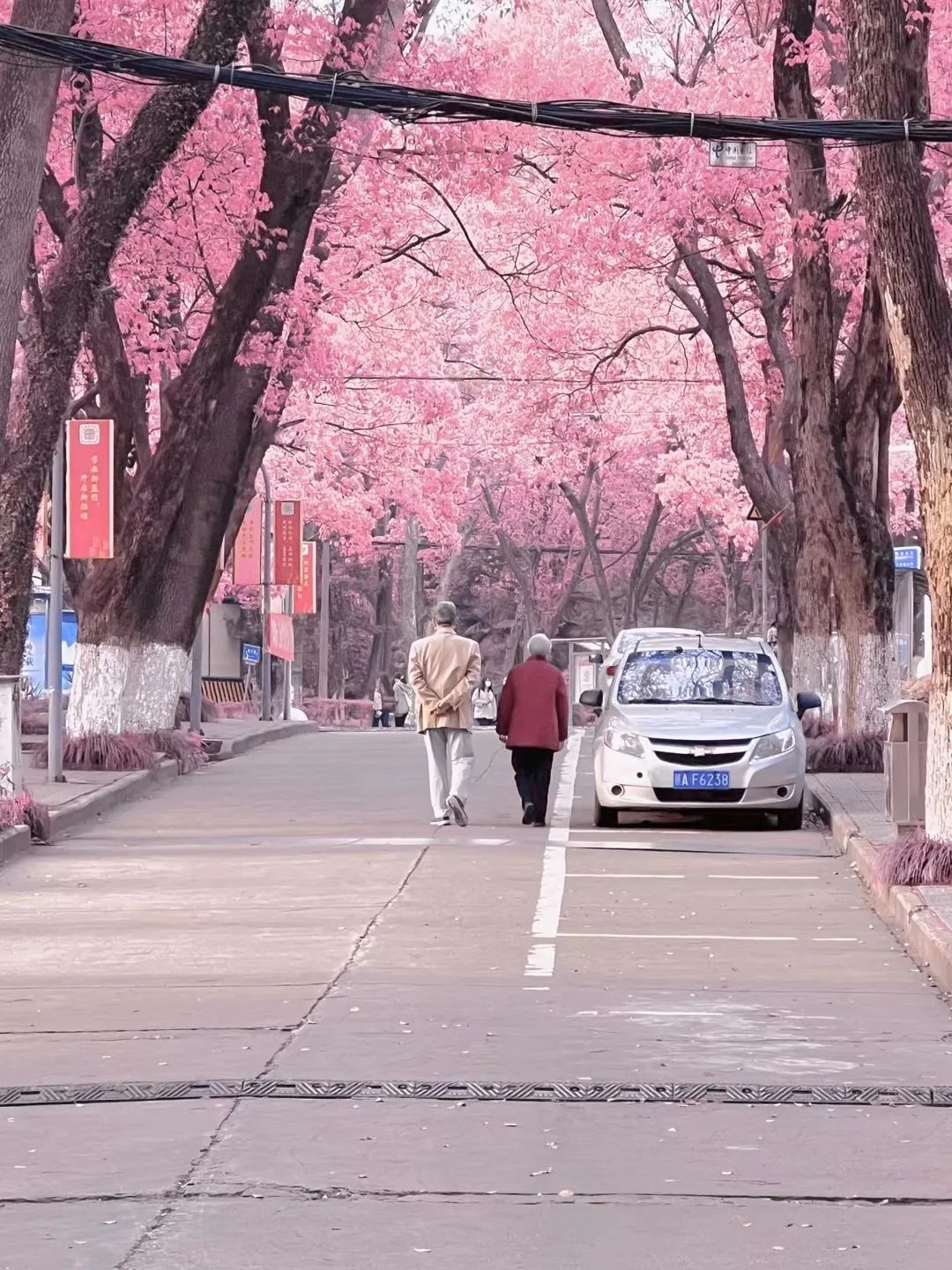 学校里,一对老教授走在两旁种着香樟的路上,慢悠悠地享受着片刻美好。都说“最美不过夕阳红”,粉色滤镜之下仿佛来到了宫崎骏的画里,特别温馨。