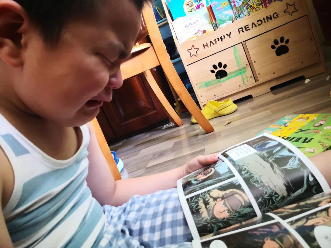 照片里的小男孩,是我儿子果果,今年7岁。那天,他在读邱少云的故事,读着读着突然号啕大哭。故事读完后,起来抱着我继续哭,边哭边说:“妈妈,邱少云牺牲了,我太难过了……”