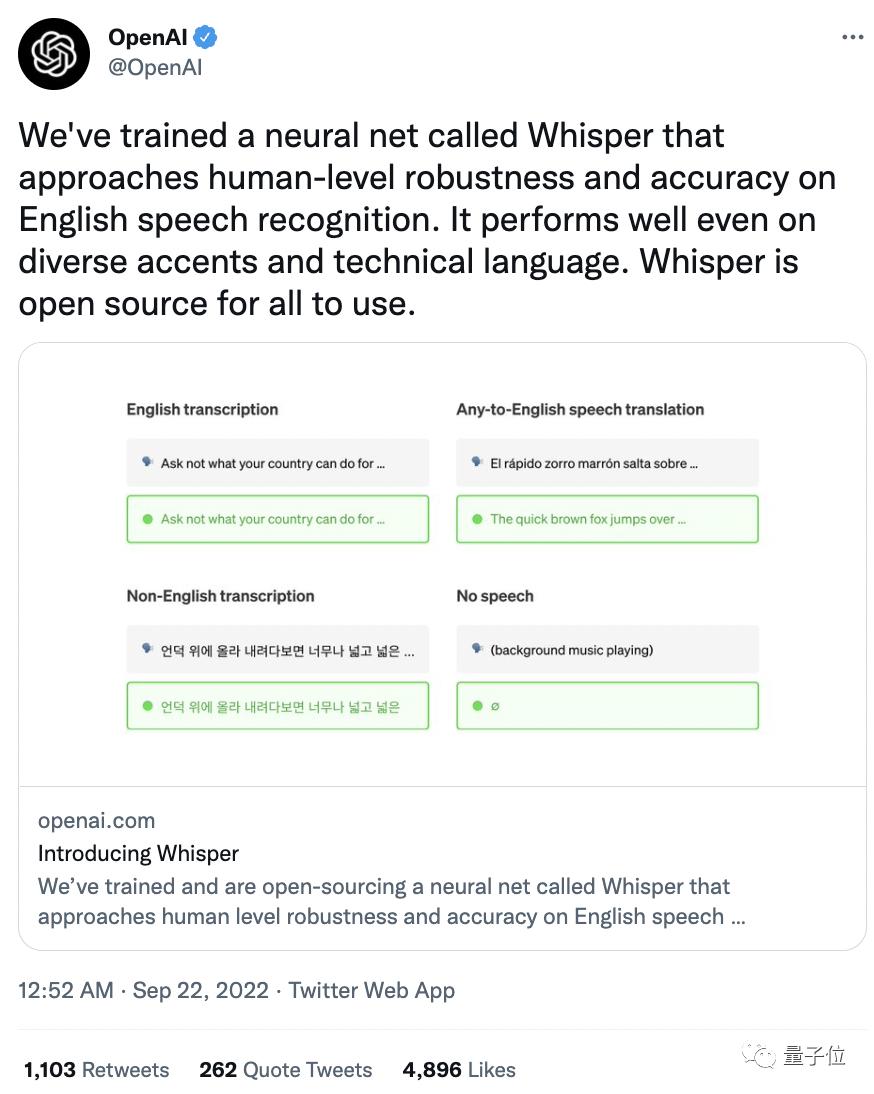 没错,OpenAI新开源了一个名为「Whisper」的新语音识别系统,据称在英文语音识别方面拥有接近人类水平的鲁棒性和准确性!