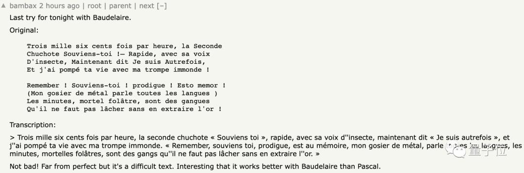 网友们纷纷对它意料之外的强大功能表示惊讶。不仅是英文,有人用法国诗人波德莱尔的《恶之花》进行了语音测试,得到的文本几乎与原文一致。