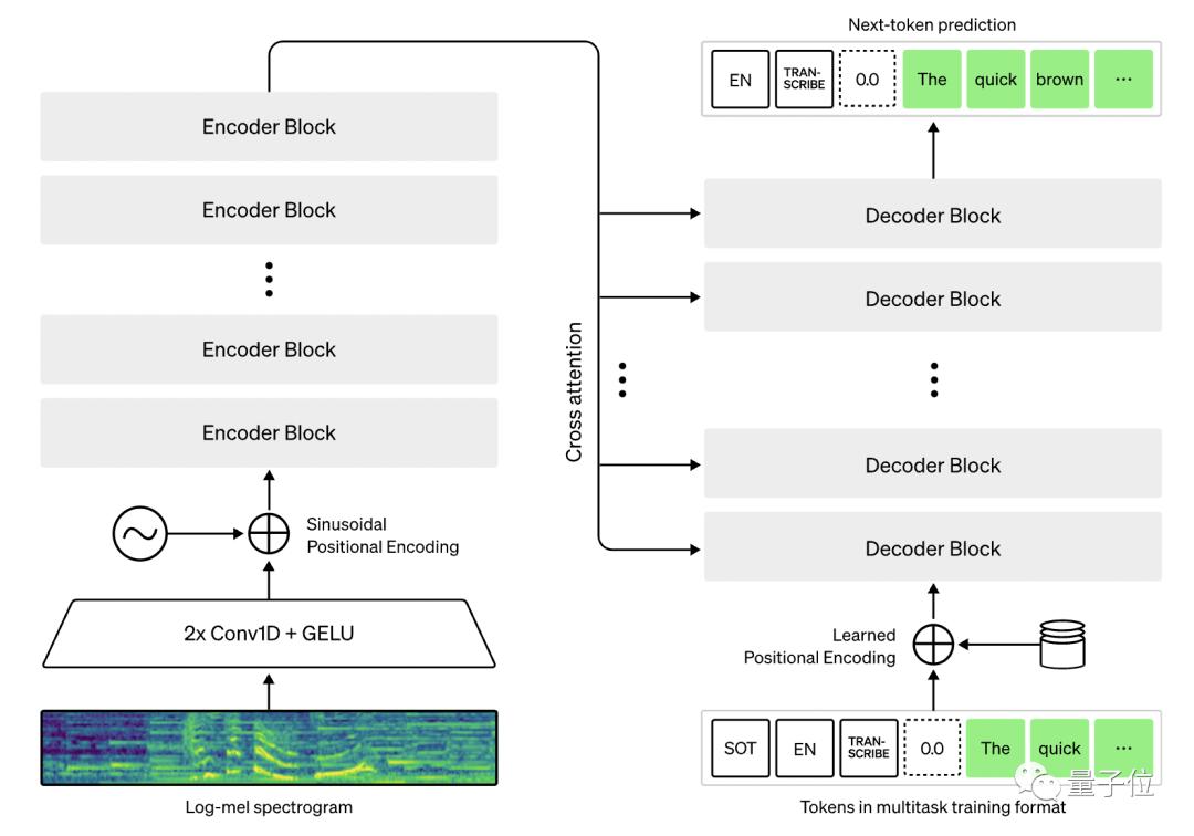 其次,Whisper体系结构是一种简单的端到端方法,具体来说就是Transformer的编码器-解码器格式。