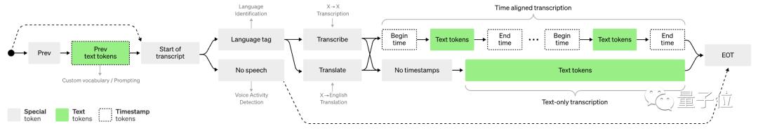 输入音频被分成30秒的片段,再转换成log-Mel谱图,然后传入编码器。解码器被训练来预测相应的文本标题,并混合特殊标记,指示单一模型执行诸如语言识别、多语言语音转录和英语语音翻译等任务。