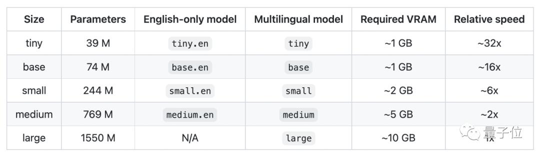 除此之外,研究人员还为Whisper设置了5种不同的型号,以下是各模型大致的内存需求和相对速度,使用者可以自行选择。但需要注意的是,只有“large”型号支持多语言,前4个模型都只支持英语。