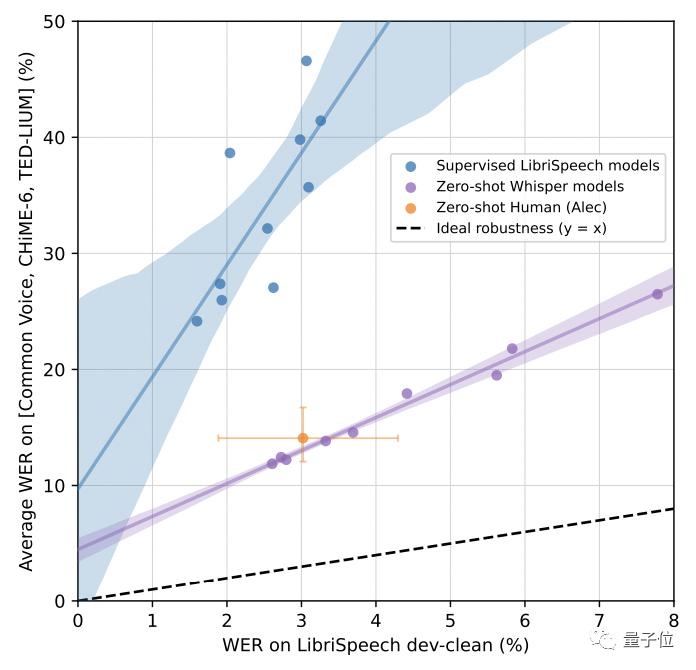 虽然这一数值与Wav2vec 2.0一样,但在零样本性能上,Whisper明显更稳健,平均误差减少了55%。