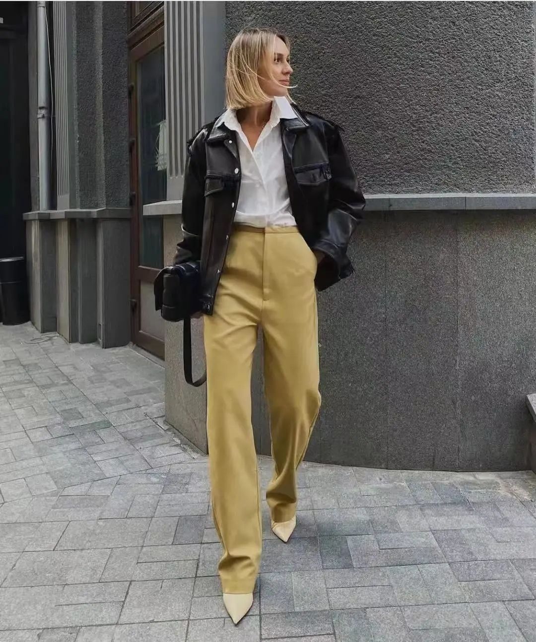 这套look用西装裤配小香风外套,露出黑白拼色的尖头小高跟,呼应整体色调,女人味更足,巧妙又和谐。