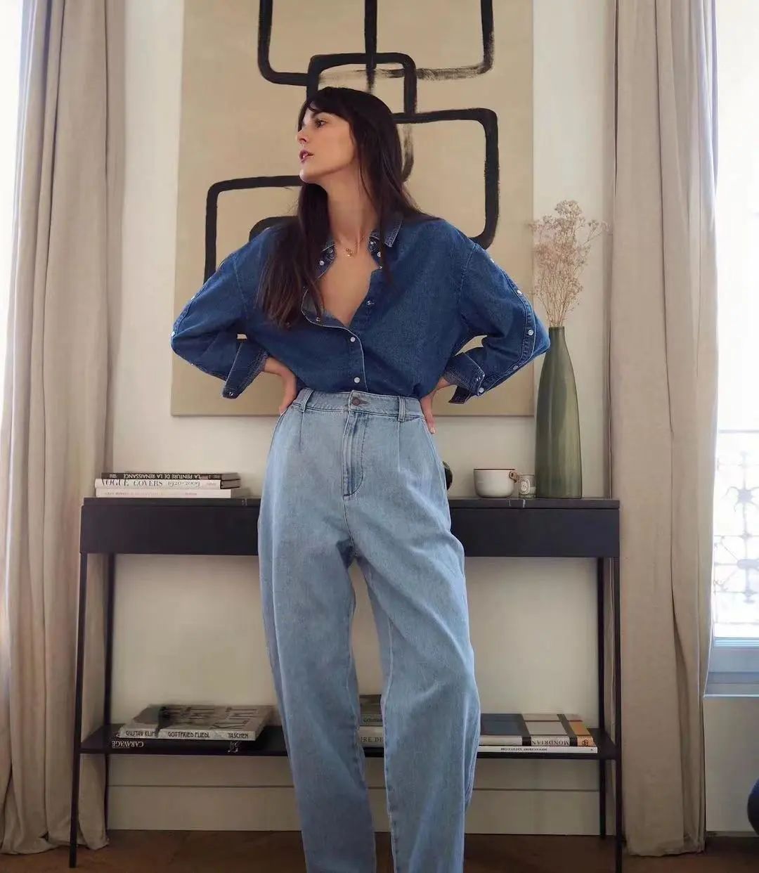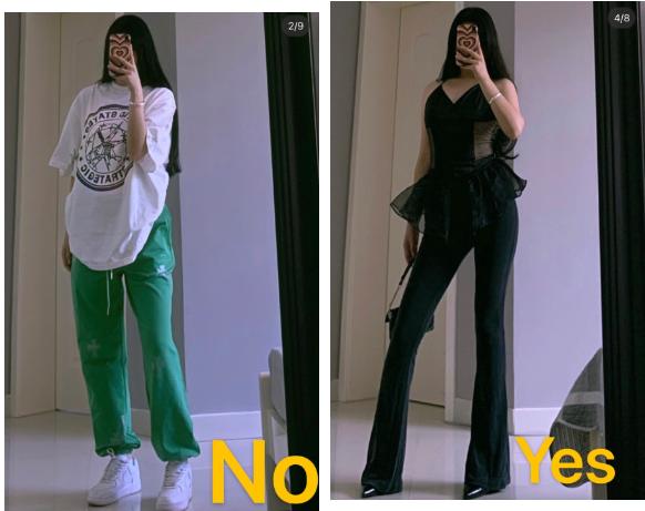 这种从臀部到腿部的线条是流畅且宽大的裤型,即使你腿型不完美,还有胯宽的问题,都可以隐藏在这宽宽的裤腿中。