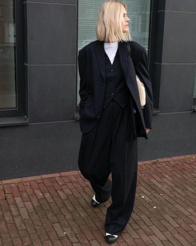 如果更倾向于Boyish感,可以将基础的衬衫、马甲等单品穿得更板正些。像 Linda Tol 这样精致的套装造型,穿出了妥妥的英伦绅士范儿。