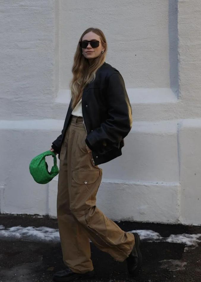直筒版型的工装裤,看起来比较宽松,遵循“上紧下松”搭配法,有张有弛,更有型。