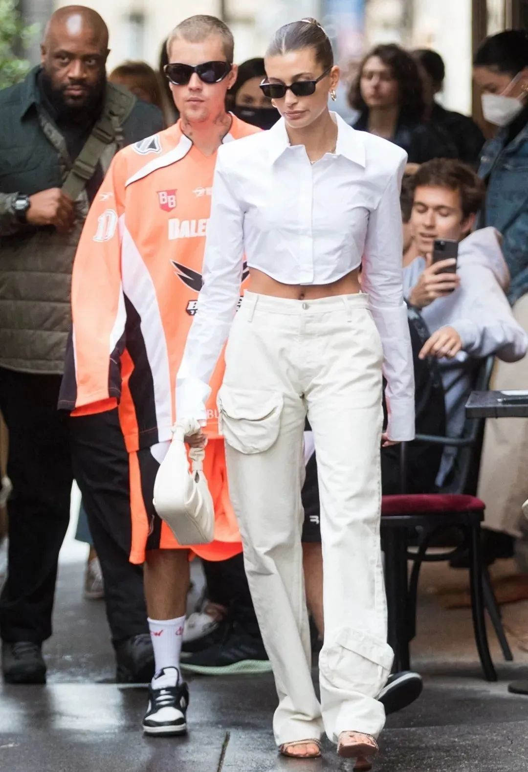 Bella则紧跟潮流,选了条低腰工装裤,搭配短款皮上衣,尽显性感本色,还多了几分帅气感。