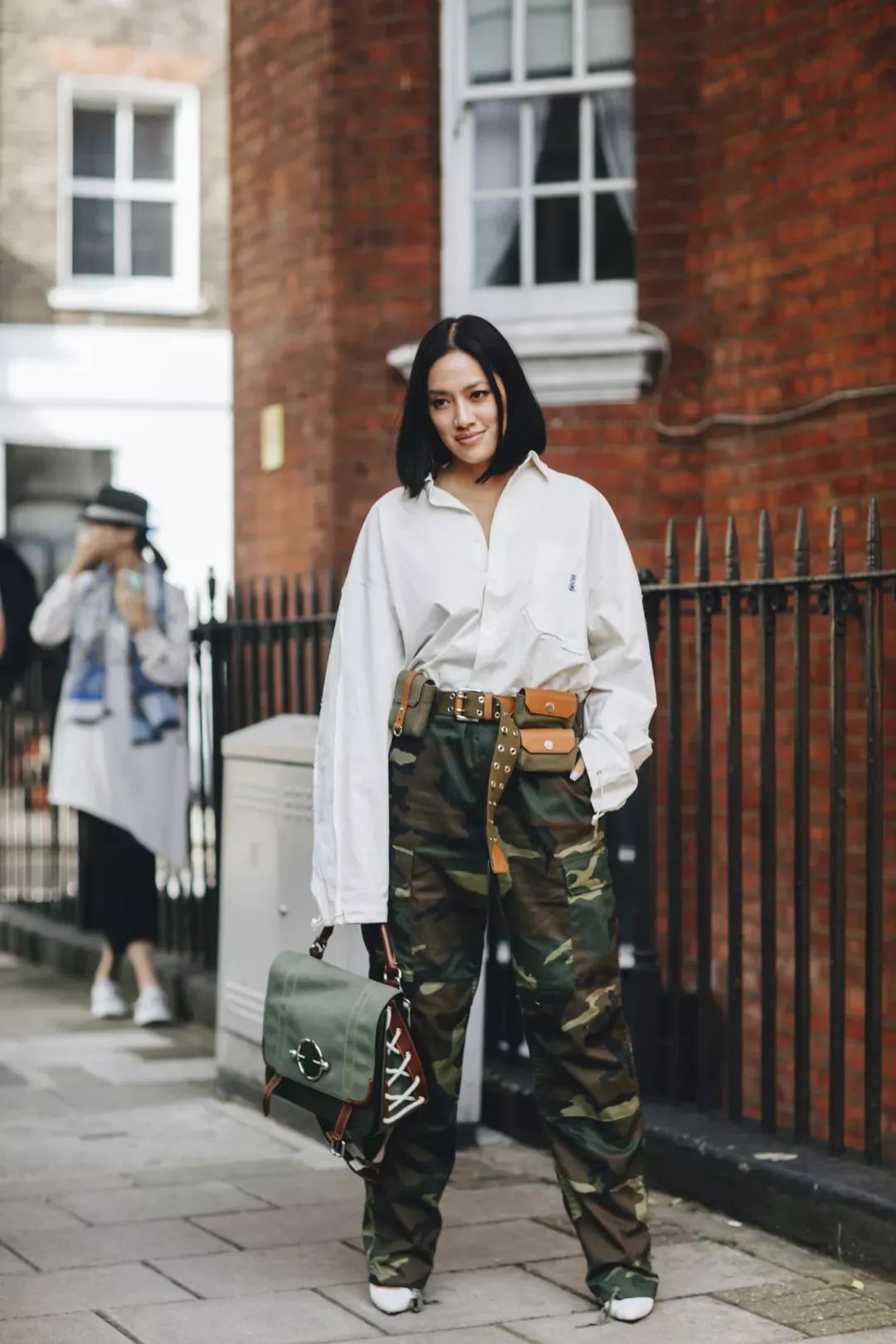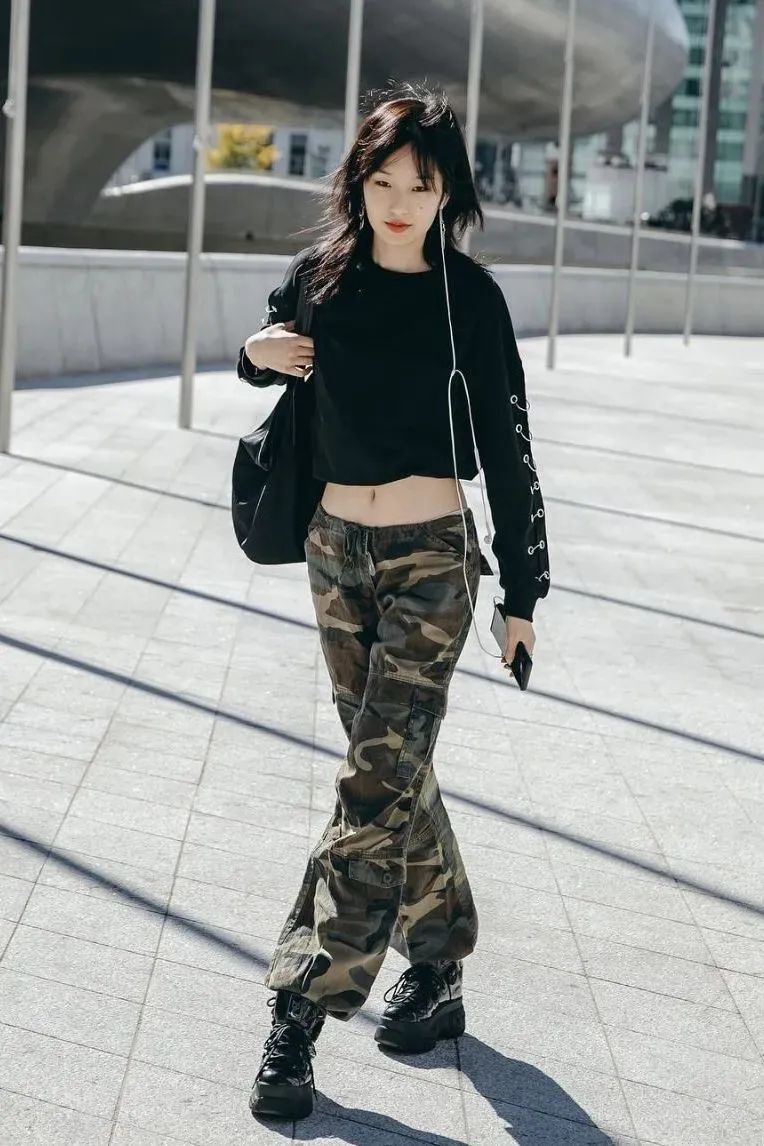 像这种经典的迷彩工装裤,本就是繁杂的设计,所以在搭配的时候,尽量选择简约的单品,上简下繁,穿出层次感的同时还不会显得突兀。