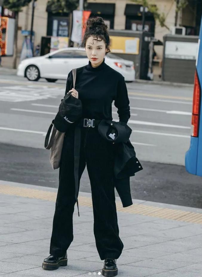 黑色的工装裤上身英姿飒爽,选择All black造型,用马丁靴加持,帅到不行,酷女孩必须mark住。