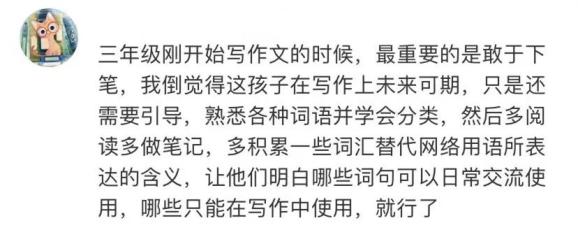 学生使用网络用语写作,可能是无意所为,但老师和家长得提醒孩子注意流行用语和标准汉语的边界,并通过背诵积累和写作训练帮助其提高语言表达能力和写作能力。来源丨澎湃新闻、九派新闻、光明网、青春深圳、青春上海等