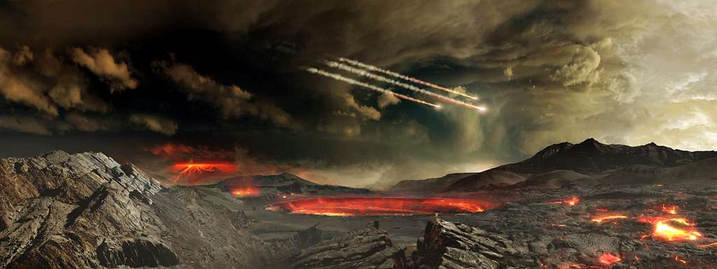 这时候的地球上,也可能与月球、火星、金星类似,出现了许多陨石坑。那时的地表荒芜干燥,其宏观的景观以陨石坑为主。其中大型陨石坑中央凹陷,周围隆起形成环形山。