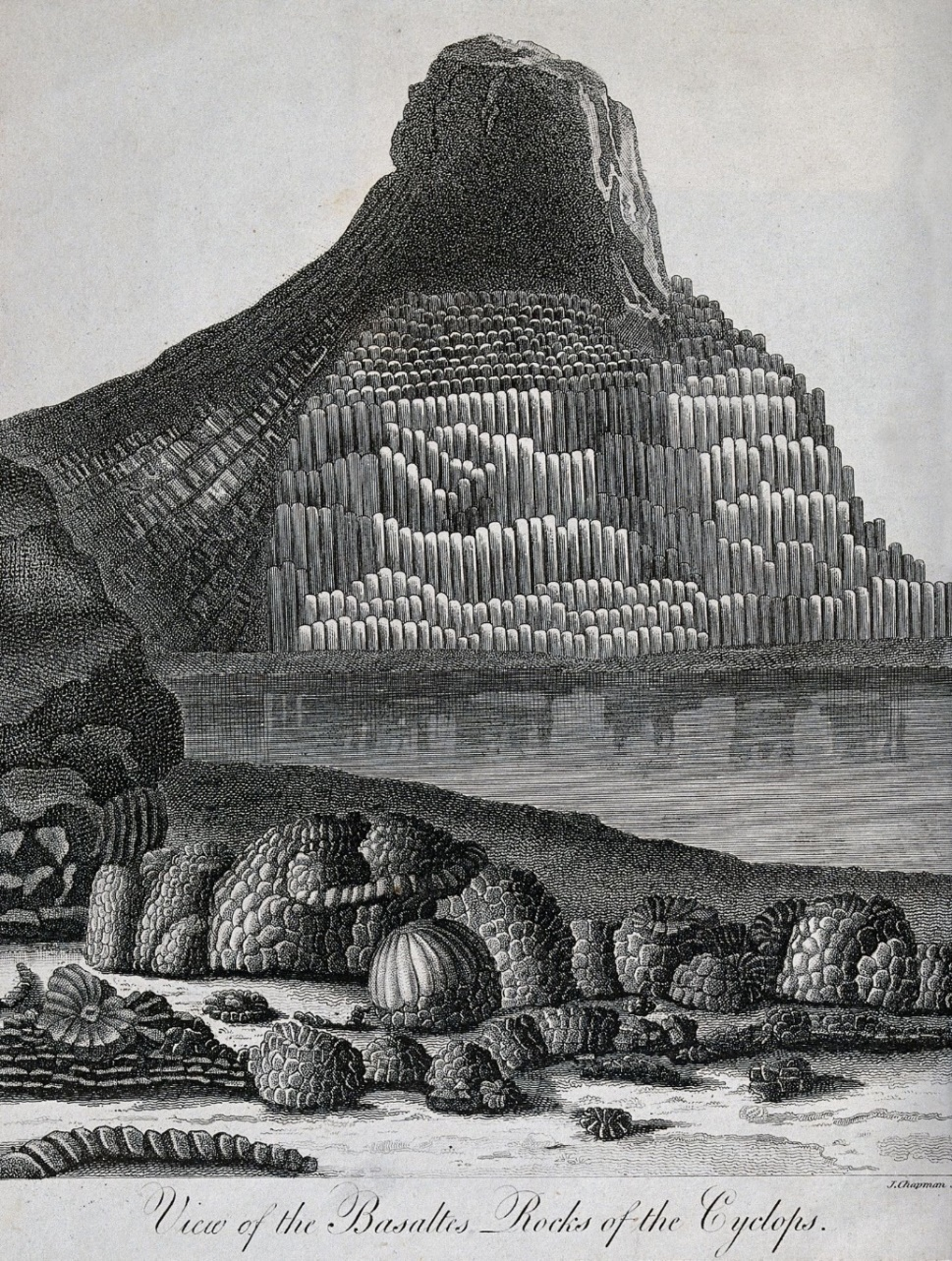 如果贴近岛屿看,可能还会发现有大量的玄武岩石柱存在,其构成的风景可能如下图: