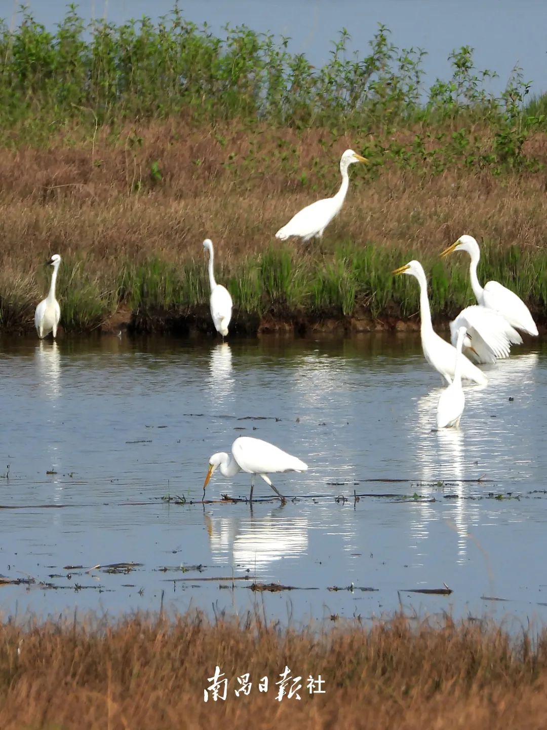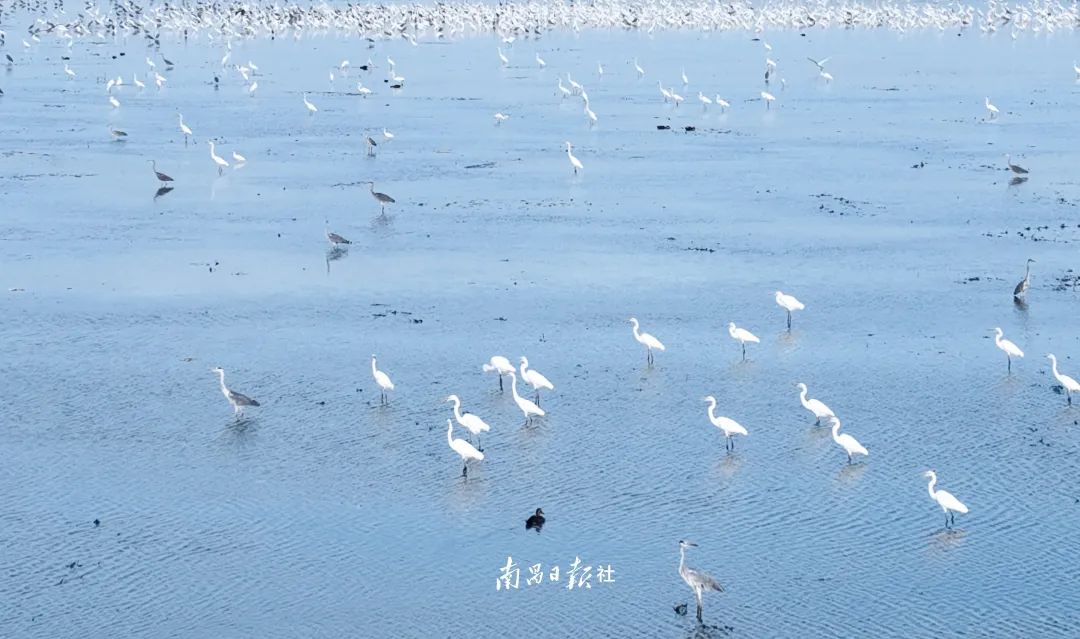 每年10月至次年4月,南矶湿地迎来 “枯水期”,水落滩出河湖交错,数十万羽候鸟迁徙至此,过冬栖息、养育后代。