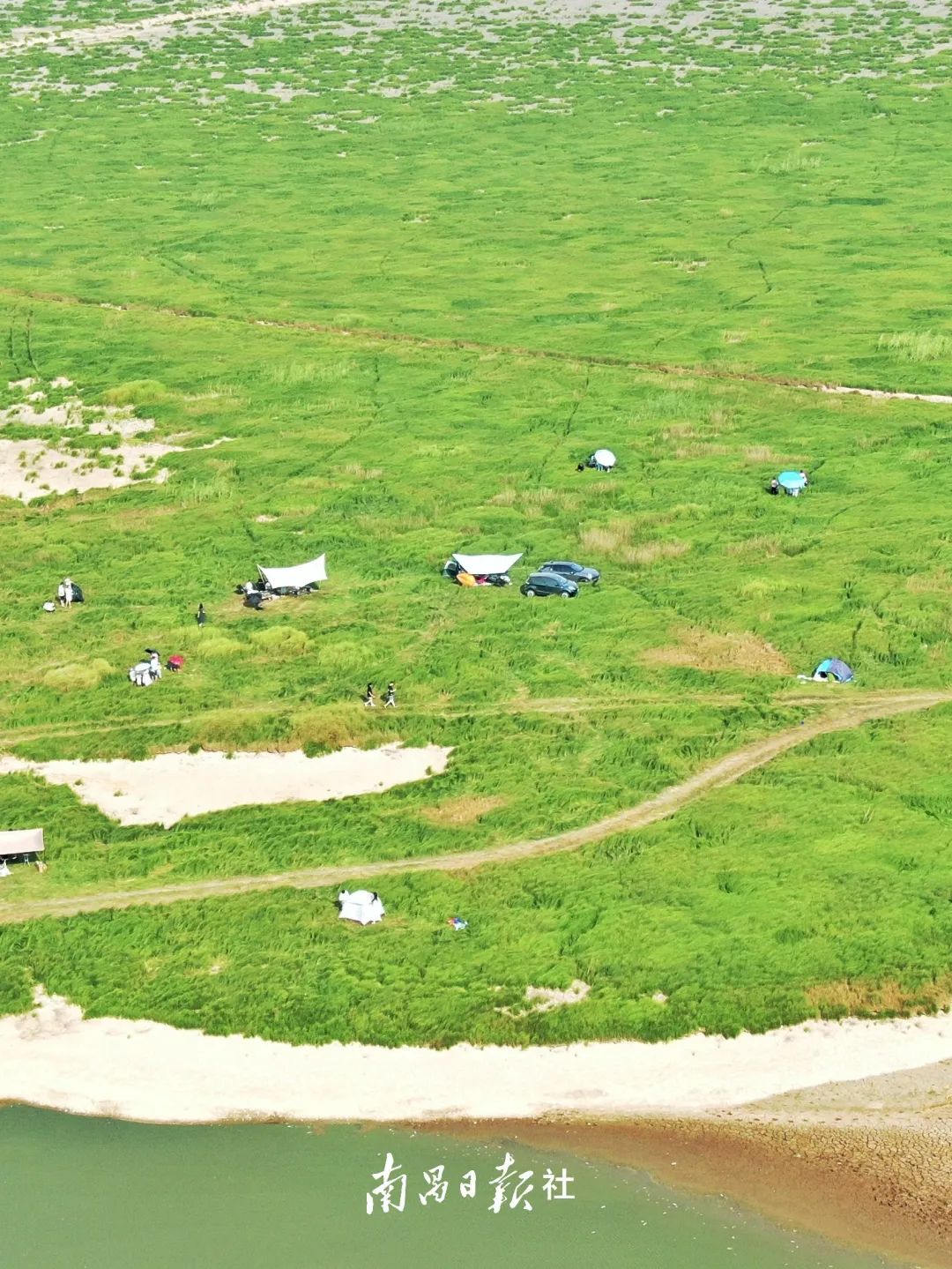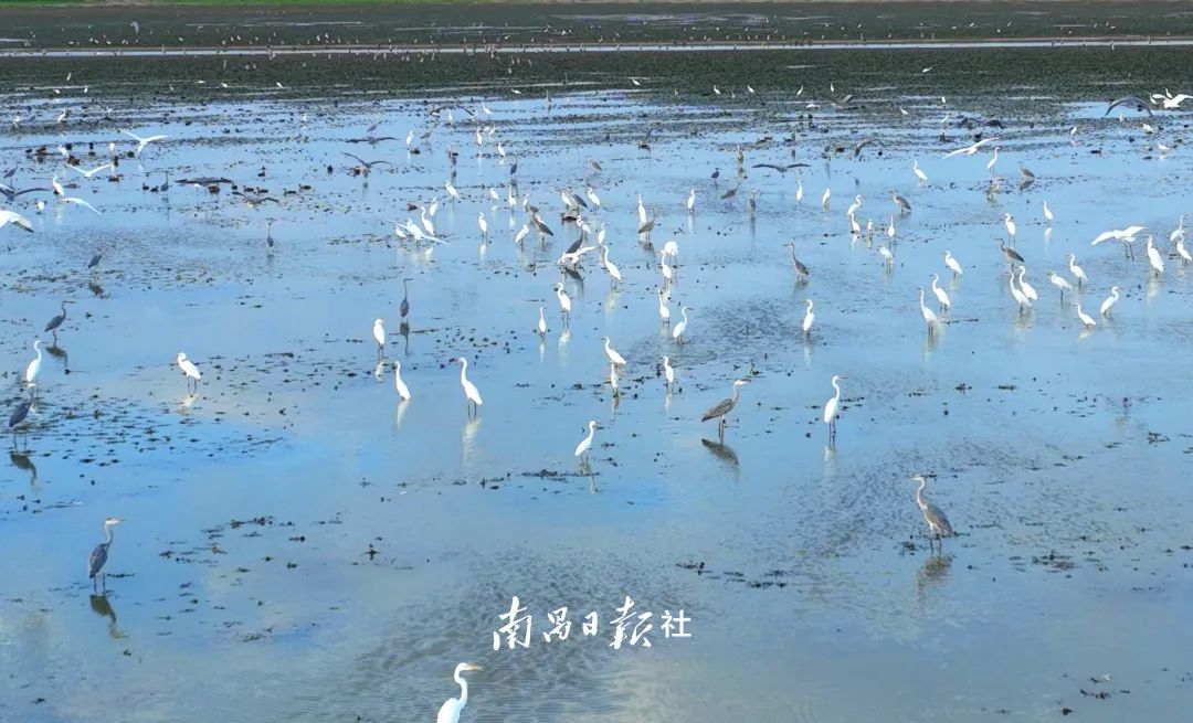 从空中俯瞰,南矶湿地水位降低鹭鸟翔集,有的在水草丰美的绿洲上觅食嬉戏,有的在广阔的天空中自在翱翔,一派生机盎然的景象。