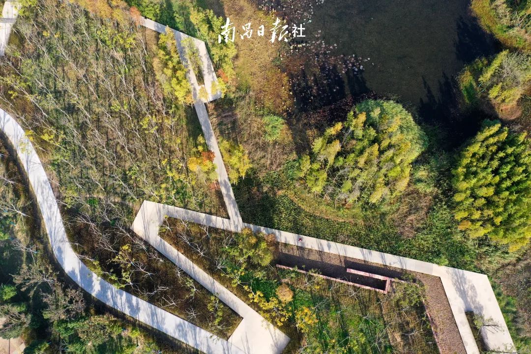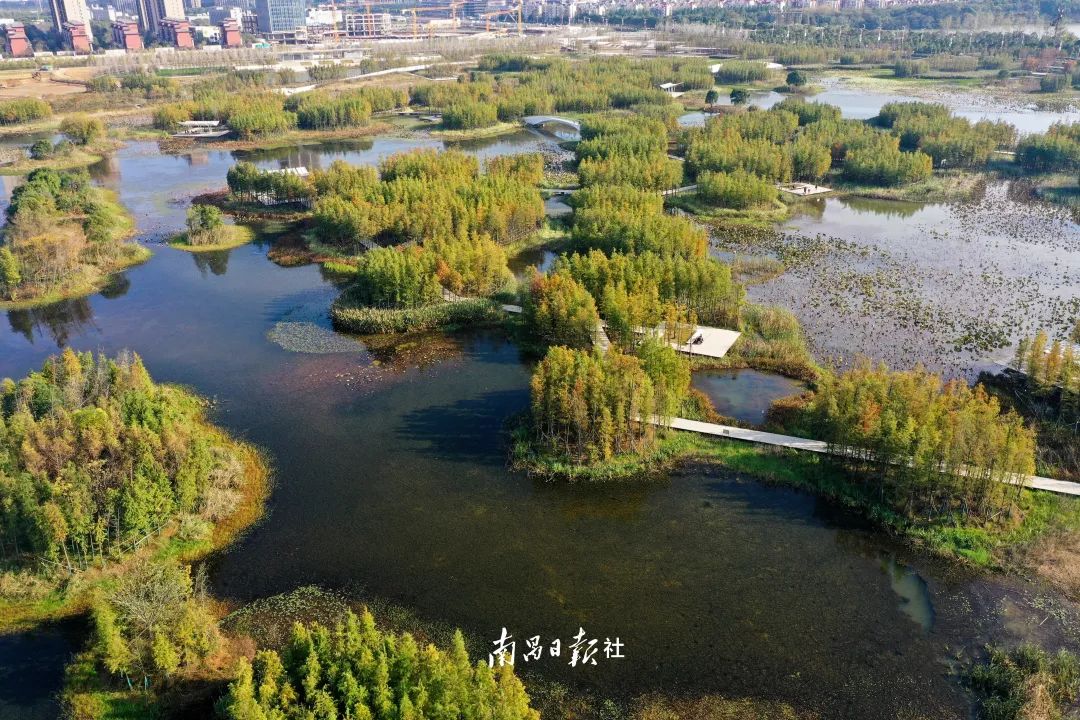 鱼尾洲湿地公园位于南昌高新区,在这里,漫步在水上森林栈道可以看到逾万株高大挺拔的池杉树,“一半在水中,一半在天空”,整齐笔直地耸立,像一个个卫士守卫着这片湿地。